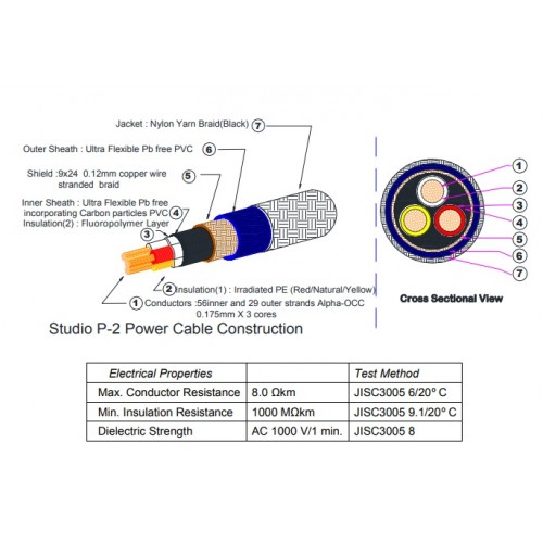Najwyższej klasy przewód zasilający. Przewodniki wykonane z miedzi Alpha-OCC o średnicy 1,9mm. Izolacja wykonana z elastycznego PVC i teflonu. Z zewnątrz kabel jest zabezpieczony nylonową plecionką o średnicy zewnętrznej 15,5mm.